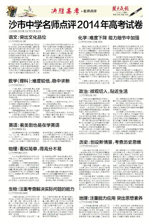 《楚天民报》6月9日专版刊登我校教师点评高考各科试卷