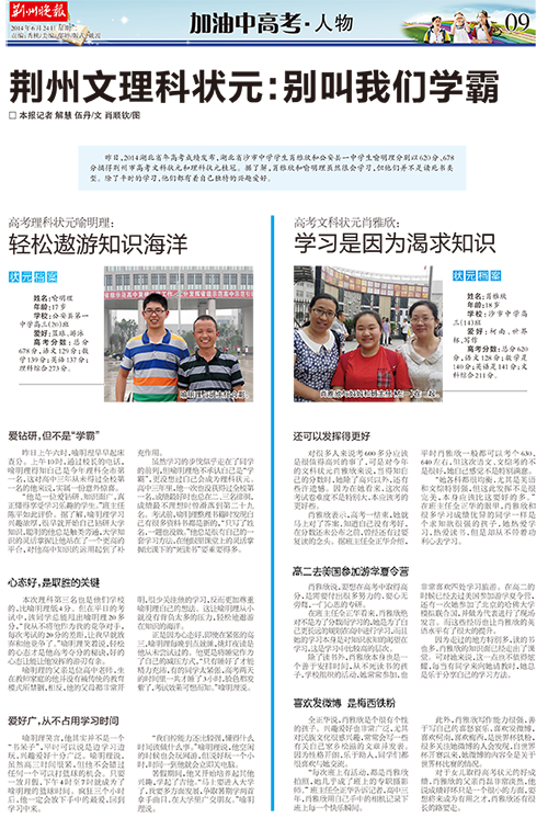 《荆州晚报》6月24日报道我校肖雅欣同学夺得荆州高考文科状元