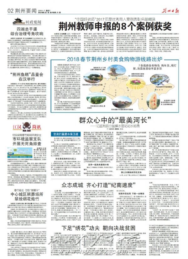 《荆州日报》2018年1月17日报道我校教师获得"中国好老师"2017年度优秀教育案例奖