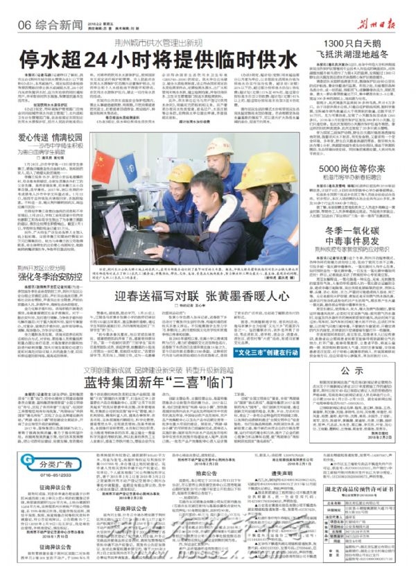 《荆州日报》2018年2月2日报道我校师生积极为患白血病学生捐款