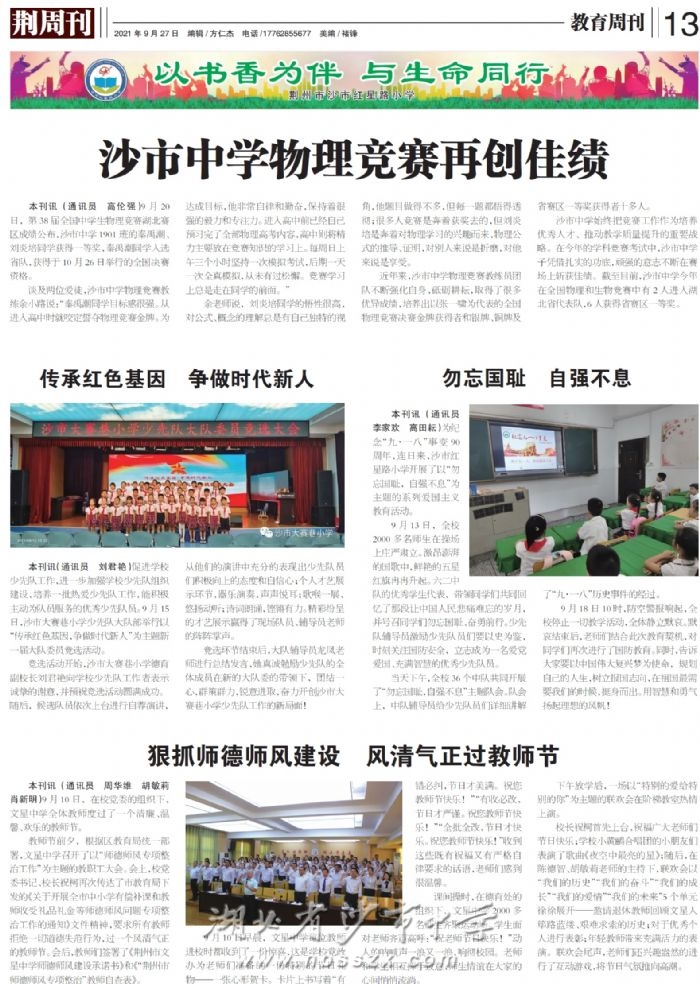 《荆周刊》2021年9月27日报道我校物理竞赛再创佳绩