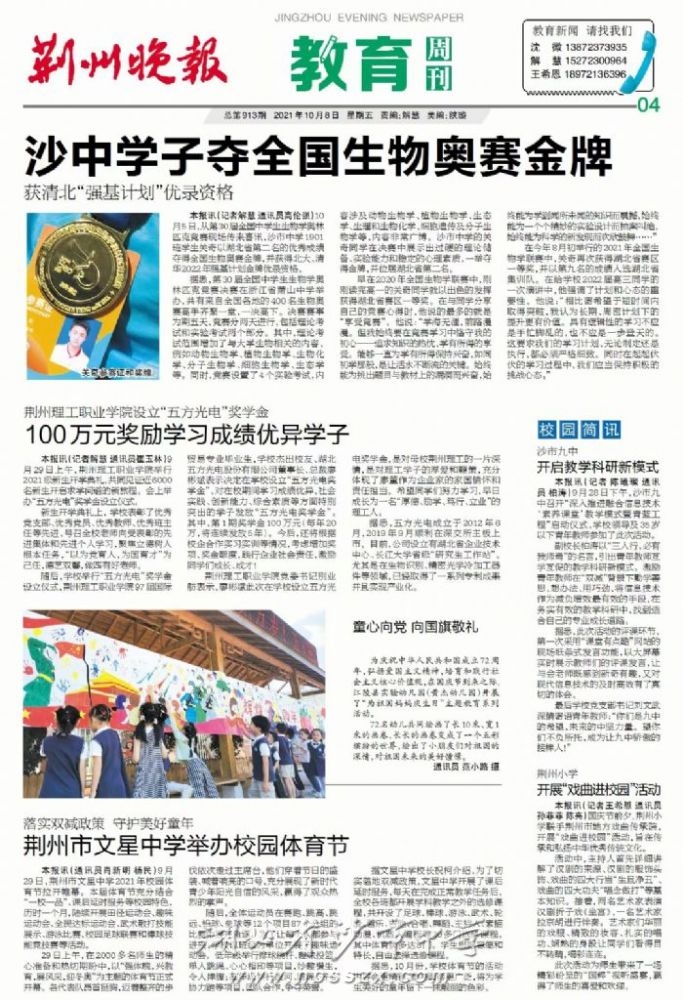 《荆州晚报》2021年10月8日报道我校学子夺得生物奥赛金牌