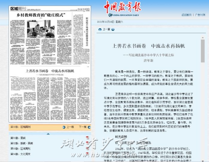 《中国教育报》2021年10月16日第3版刊发了我校80周年校庆专题文章《上善若水书画卷 中流击水再扬帆——写在八十华诞之际》。
