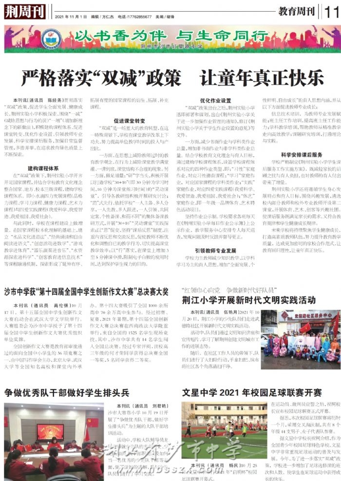 《荆周刊》2021年11月1日报道我校获"第十四届全国中学生创新作文大赛"总决赛大奖