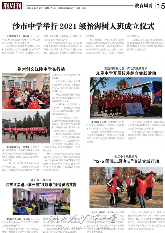 《荆周刊》2021年12月13日报道我校举行2021级怡海树人班成立仪式
