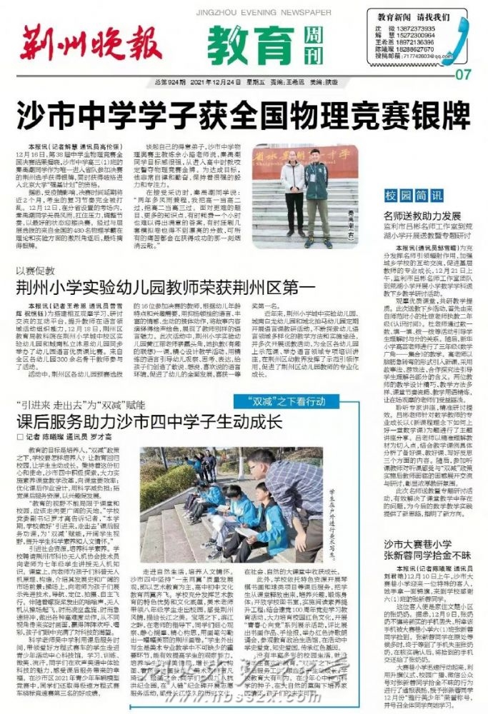 《荆州晚报》2021年12月24日报道我校学子获全国物理竞赛决赛银牌