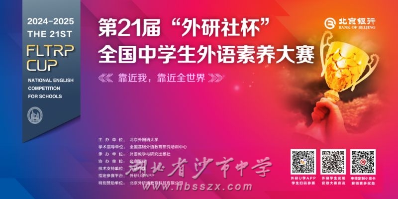 “外研社杯”全国中学生外语素养大赛是入围教育部全国中小学生竞赛活动名单、面向全国高中学生举办的公益赛事。大赛由北京外国语大学主办、外语教学与研究出版社承办、北京银行协办,以全面培养学生的核心素养为理念,设置了主线清晰、内容多元的赛事体系,突出学术权威性与活动丰富性,旨在帮助学生成长为热爱学习、勇于挑战、真正具备国际竞争力的优秀人才。