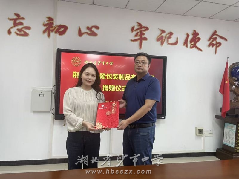 9月12日上午,沙市中学迎来了一场充满爱心与温暖的捐赠活动。荆州市先隆包装制品有限公司代表邹雅丽女士莅临我校,为支持学校教育事业发展带来了宝贵的捐赠资金。沙市中学党委副书记、校长徐善慧代表学校向该公司表示衷心的感谢。
