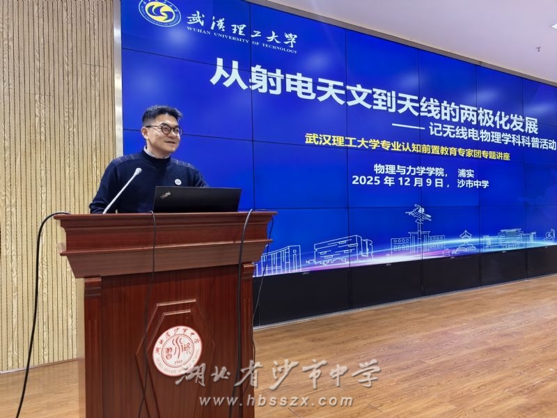 12月9日,沙市中学习坎讲坛在综合楼二楼会议室如期举行。本次讲座特邀武汉理工大学浦实副教授主讲,主题为《从射电天文到天线的两极化发展——记无线电物理学科科普活动》,高二年级部分学生现场聆听。