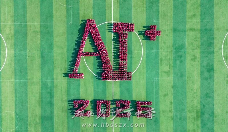 1月6日,沙市中学绿茵场上一片鲜红涌动,2025级高一学生身着统一红色校服,以身体为“像素”,共同拼出巨型“AI﹢2026”字样,用一场充满科技感与青春气息的创意造型活动,迎接新年的到来。