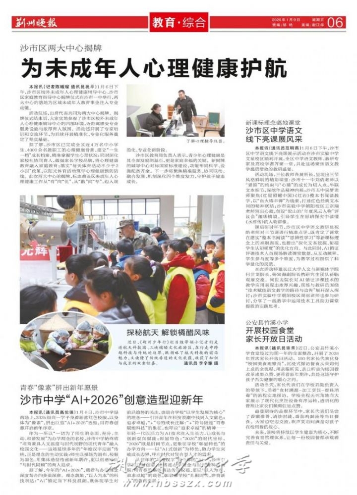 《荆州晚报》2026年1月9日报道报道我校以"AI+2026"的创意造型迎新年