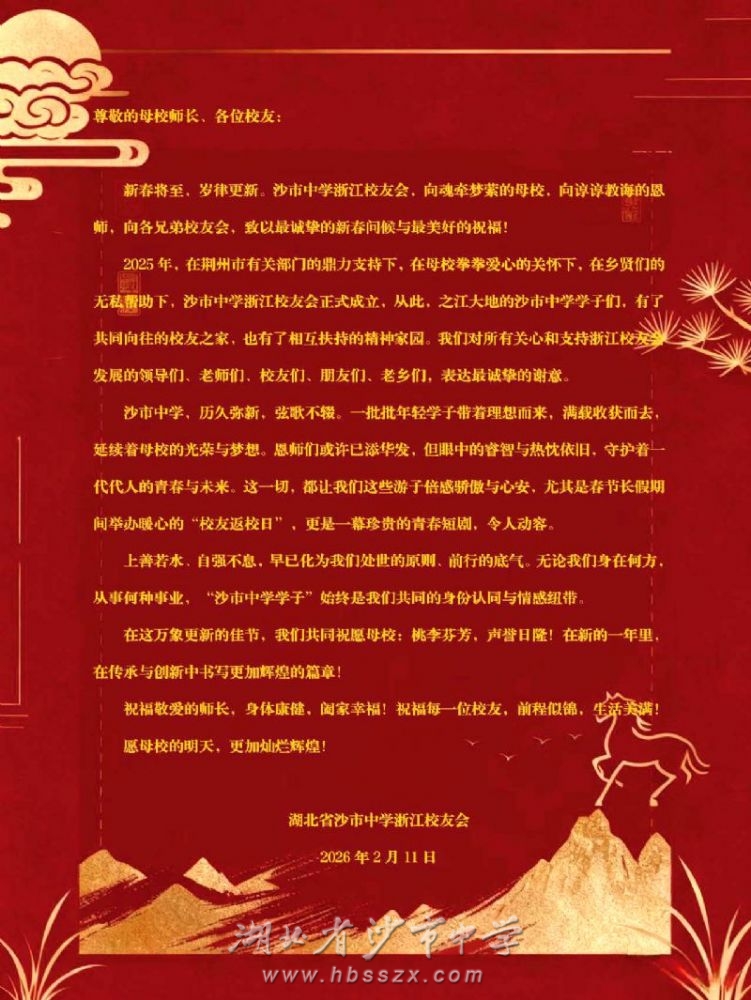 马年春节将至,沙市中学浙江校友会于2月11日发来贺信,向母校师长、各届校友、各界朋友、各位老乡送来了诚挚而美好的祝福。贺信全文如下:
