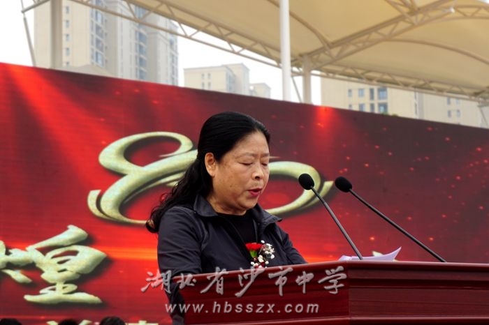退休教师代表、沙市中学特级教师周琼发言。她表示,对自己工作了一辈子的学校充满深深的爱,自己永远不会忘记上善若水、自强不息的习坎文化、习坎精神,不会忘记那生机勃勃的课堂、朝气蓬勃的操场、清澈的眼睛里流露出智慧和青春的光芒;不会忘记老教师们是怎样俯首甘为孺子牛,传授知识、架设人梯;不会忘记为学校发展作出阶段性贡献的老校长们;不会忘记一心一意为学生为老师服务的贴心后勤职工;不会忘记那些常怀感恩之心、赤子之心,回馈母校以及脚下的这方土地的无数校友们。她深情地说,沙市中学八十年的历史精彩纷呈,还将继续威武雄壮地演绎下去。她祝福人杰地灵的沙市中学,一定会有更加辉煌的未来。