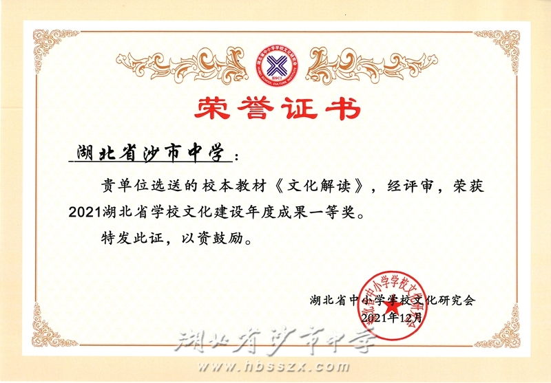 12月24日至26日,第十三届湖北论坛与“第三次会员代表大会”在武汉举行。在大会进行的评比中,沙市中学被授予“2021湖北省建设百强校”荣誉称号,唐年新、秦卓琼老师被评为2021湖北省建设先进工作者,校本教材《文化解读》被评为2021湖北省建设年度成果一等奖,唐年新、张丹合著的《如何在中学生中开展党史教育》荣2021湖北建设优秀论文奖。
