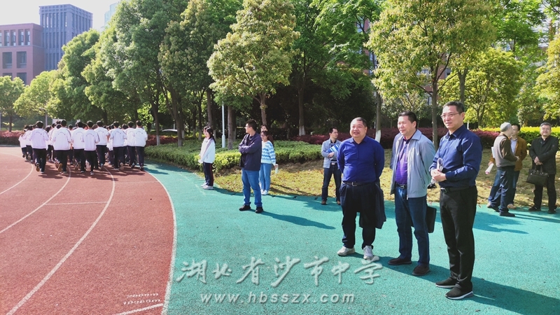 观看大课间。高一高二同学着装统一,队伍整齐,口号响亮,精神抖擞地迎接视导。