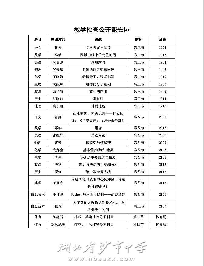分学科评课交流。各学科教研员就汇报课和备教批辅考等方面的检查情况,从新课标、新教材、新高考角度与沙市中学本学科全体教师进行了深入交流。视导组专家们肯定了我校教师扎实的教学功底和专业素养,高度赞扬了我校学生的综合素质。同时,也指出了部分课堂存在的不足,如有些仍以教师讲解为主,面面俱到,导致学生的主体地位和课堂教学重点不够突出等。针对以上问题,视导组提出了切实可行的整改建议。